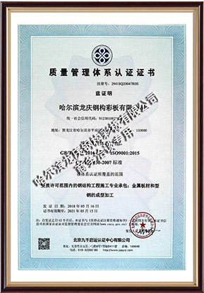 龍慶鋼構(gòu)彩板有限公司 目前擁有鋼結(jié)構(gòu)制造一級、鋼結(jié)構(gòu)承包一級、施工總承包二級、ISO9001質(zhì)量體系認證、信用等級AAA級企業(yè)。公司總占地30萬平米,在職員工1000余人,同時擁有重鋼、輕鋼生產(chǎn)基地5個,年產(chǎn)值20萬噸。主要涉及有:鋼結(jié)構(gòu)系列、彩鋼壓型板系列、彩鋼夾芯板系列、組合樓板系列等工程配套產(chǎn)品。廣泛應用于:工業(yè)廠房、體育場館、高鐵站房、機場航站樓、超高層、畜牧行業(yè)、乳品行業(yè)、倉儲冷鏈物流、石油化工、醫(yī)藥、食品加工行業(yè)、橋梁、物流等等。